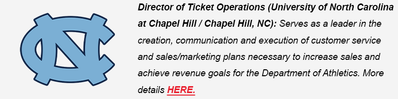 (NEWEST!) Director of Ticket Operations (University of North Carolina at Chapel Hill / Chapel Hill, NC): Serves as a leader in the creation, communication and execution of customer service and sales/marketing plans necessary to increase sales and achieve revenue goals for the Department of Athletics. More details HERE.