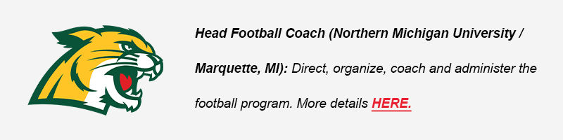 (NEW!) Head Football Coach (Northern Michigan University / Marquette, MI): Direct, organize, coach and administer the football program. More details HERE.
