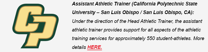 (NEWEST!) Assistant Athletic Trainer (California Polytechnic State University – San Luis Obispo / San Luis Obispo, CA): Under the direction of the Head Athletic Trainer, the assistant athletic trainer provides support for all aspects of the athletic training services for approximately 550 student-athletes. More details HERE.