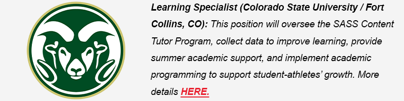 (NEWEST!) Learning Specialist (Colorado State University / Fort Collins, CO): This position will oversee the SASS Content Tutor Program, collect data to improve learning, provide summer academic support, and implement academic programming to support student-athletes’ growth. More details HERE.
