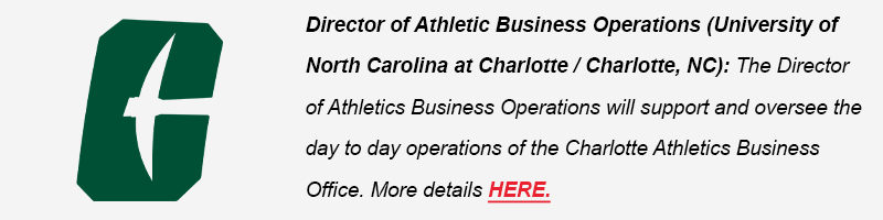 (NEWEST!) Director of Athletic Business Operations (University of North Carolina at Charlotte / Charlotte, NC): The Director of Athletics Business Operations will support and oversee the day to day operations of the Charlotte Athletics Business Office. More details HERE.