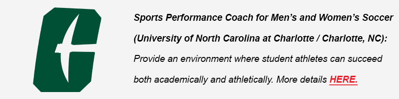 (NEWEST!) Sports Performance Coach for Men’s and Women’s Soccer (University of North Carolina at Charlotte / Charlotte, NC): Provide an environment where student athletes can succeed both academically and athletically. More details HERE