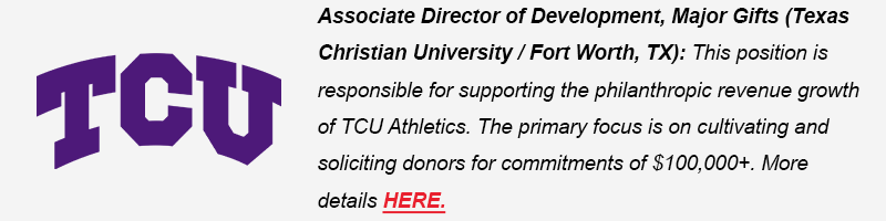 (NEWEST!) Associate Director of Development, Major Gifts (Texas Christian University / Fort Worth, TX): This position is responsible for supporting the philanthropic revenue growth of TCU Athletics. The primary focus is on cultivating and soliciting donors for commitments of $100,000+. More details HERE.
