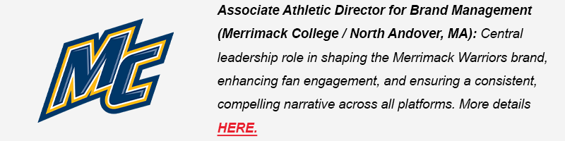 Associate Athletic Director for Brand Management (Merrimack College / North Andover, MA): More details HERE.