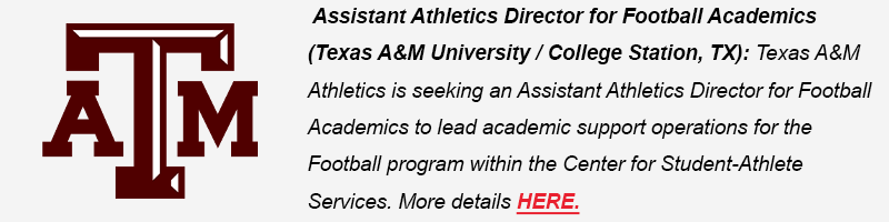 (NEW!) Assistant Athletics Director for Football Academics (Texas A&M University / College Station, TX): Texas A&M Athletics is seeking an Assistant Athletics Director for Football Academics to lead academic support operations for the Football program within the Center for Student-Athlete Services. (DI) More details HERE.