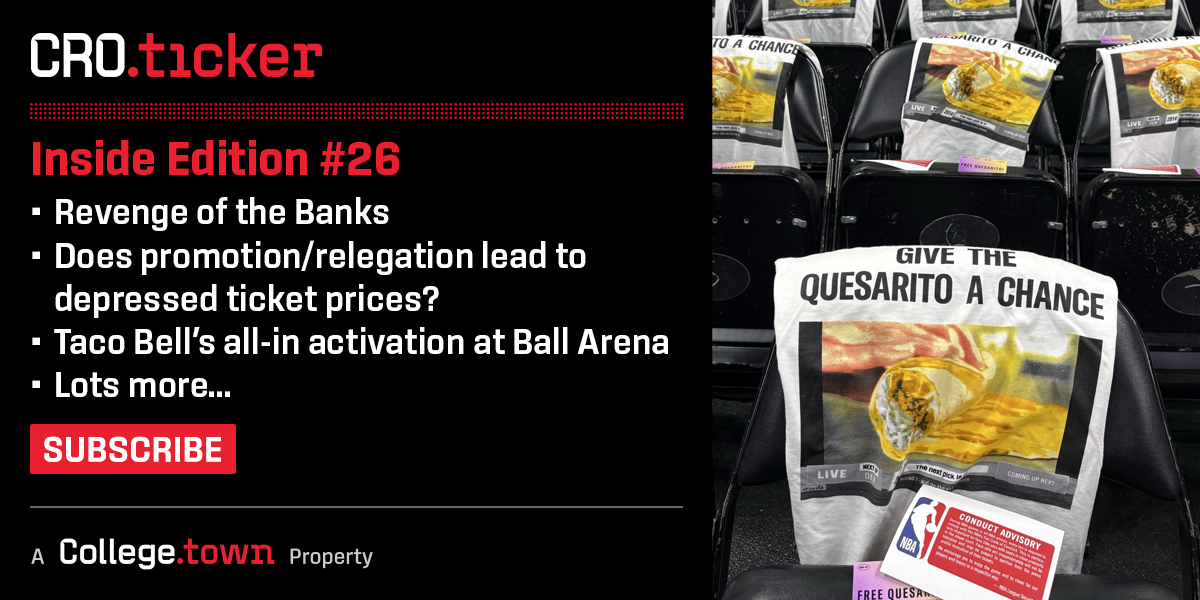 The Banks Strike Back in the latest edition of CRO.ticker, which includes a look at how traditional lenders like JPMorgan Chase, Bank of America, and Goldman Sachs are seeing share prices surge upwards of 45% while top alternative asset managers like Blackstone and KKR are collectively down. In addition to that, Texas Tech Asst. AD of Information Technology J.P. Williams joins the Sports Geek podcast to discuss the technological infrastructure supporting the Red Raiders' $250M Womble Football Center and South End Zone renovation, which created the "largest contiguous collegiate athletic facility in the nation.” Also included: more on FIFA’s dynamic pricing for the 2026 World Cup, AI friction in higher ed and Taco Bell’s “Give the Quesarito a chance” activation at Denver’s Ball Arena. Check it out. (link)