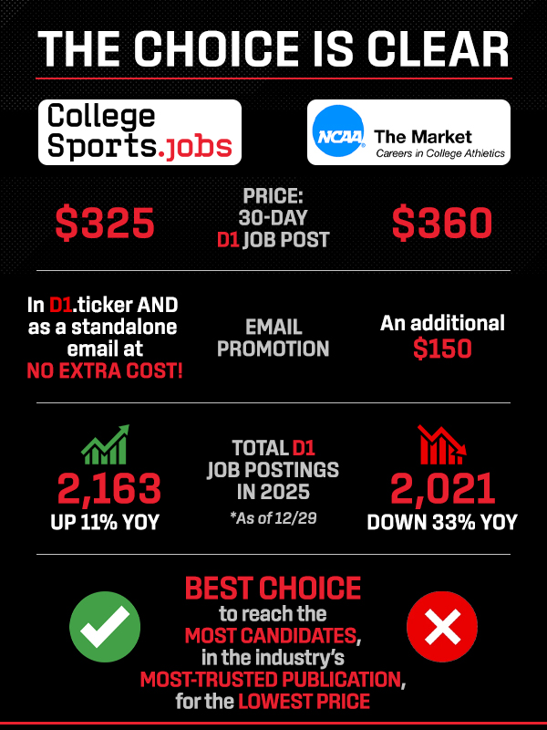 Interested in advertising a job opening in D1.ticker on CollegeSports.jobs? Submit your position here.