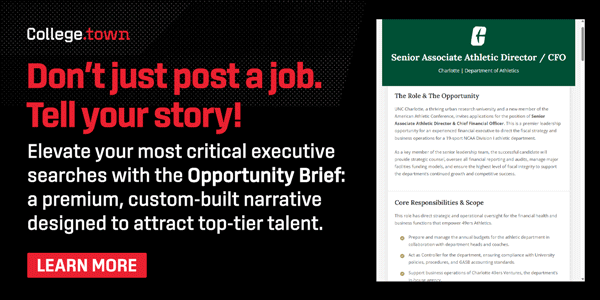 "The Opportunity Brief College.town developed was a genuine game changer. We received direct feedback from multiple industry professionals confirming that this brief was viewed as an invaluable tool in their decision-making process for applying to our CFO position. It not only attracted top-tier talent but fundamentally elevated the perception of the role and our organization." — Chris Thomasson, Exec. Assoc. AD @ UNC Charlotte
