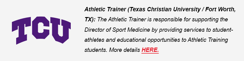 (NEW!) Athletic Trainer (Texas Christian University / Fort Worth, TX): The Athletic Trainer is responsible for supporting the Director of Sport Medicine by providing services to student athletes and educational opportunities to Athletic training students. More details HERE.