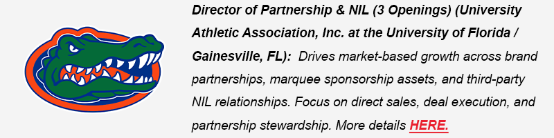 Director of Partnership & NIL (3 Openings) (University Athletic Association, Inc. at the University of Florida / Gainesville, FL): More details HERE.