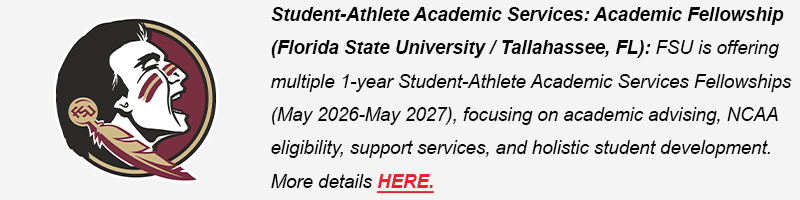 (NEWEST!) Student-Athlete Academic Services: Academic Fellowship (Florida State University / Tallahassee, FL): FSU is offering multiple 1-year Student-Athlete Academic Services Fellowships (May 2026-May 2027), focusing on academic advising, NCAA eligibility, support services, and holistic student development. More details HERE.