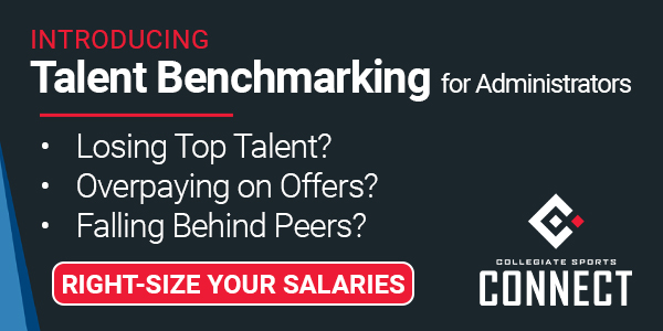 Are you losing your best administrative staff members or overpaying on new hires simply because you lack the right data? With the launch of Talent Benchmarking by Collegiate Sports Connect, athletic departments can now access the best salary database in the industry. Filter by role, conference, years of experience, region and more to benchmark your staff’s salaries to those of peer institutions. Ensure your offers are competitive and your current star performers are compensated fairly. Stop hoping you’re in the right range and start knowing for sure. (link)