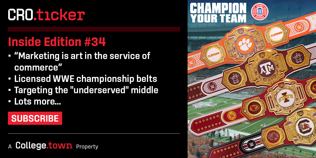➤ As for his strategy around jersey patches: “If and when that's ready to go, we have someone who wants to participate. ... I think us here at Akron, every athletics director in the country, has to devise their own strategy. Are they going to limit it to, ‘Hey, I'm going to have a jersey sponsor for football and a completely different sponsor for basketball, a different sponsor for women's hoops and a different sponsor, so on and so forth.’ We’ve got to figure out what works best. That's a little bit of the unknown for us. … We don't really know what it's worth until we see what people will truly pay us for it. Knowing that the jersey is going to be seen predominantly on television, whether that's linear or digital, I think it's going to draw big opportunities for programs. And then beyond that, how do you market it inside of your program?” More. (link)