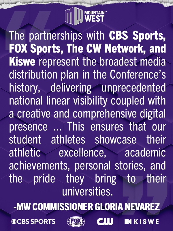 The Mountain West has signed a new media rights deal through 2031-32 with CBS Sports, FOX Sports, The CW Network and Kiswe. Per the agreement, FOX Sports will carry the league’s football championship, 12 regular season FB games and 20 men’s basketball games. CBS Sports will have the rights to 15 regular season FB games, with one to be broadcast on CBS and streamed on Paramount+, the men’s and women’s basketball championships and 20 total regular season MBB and WBB games. Starting this fall, The CW will carry 13 football games, 20 MBB games and 15 WBB games. Kiswe will develop a new direct-to-consumer streaming service that will launch this summer to stream over 1,000 live events a year, in addition to game replays and original content. Commissioner Gloria Nevarez: “The partnerships with CBS Sports, FOX Sports, The CW Network, and Kiswe represent the broadest media distribution plan in the Conference’s history, delivering unprecedented national linear visibility coupled with a creative and comprehensive digital presence. Aligning with three nationally recognized broadcast media partners and marquee streaming platforms powered by Kiswe’s expertise ensures that our student-athletes showcase their athletic excellence, academic achievements, personal stories, and the pride they bring to their universities.” (link)