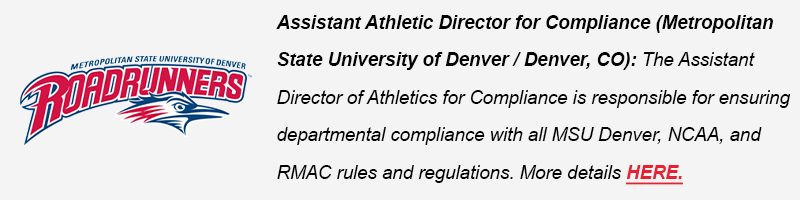 (NEW!) Assistant Athletic Director for Compliance (Metropolitan State University of Denver / Denver, CO): The Assistant Director of Athletics for Compliance is responsible for ensuring departmental compliance with all MSU Denver, NCAA, and RMAC rules and regulations. More details HERE.