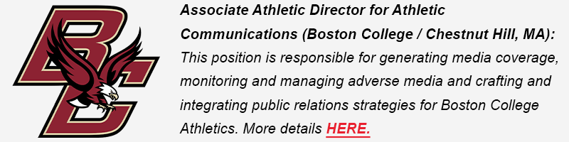 (NEW!) Associate Athletic Director for Athletic Communications (Boston College / Chestnut Hill, MA): This position is responsible for generating media coverage, monitoring and managing adverse media and crafting and integrating public relations strategies for Boston College Athletics. More details HERE.