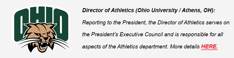 (NEW!) Director of Athletics (Ohio University / Athens, OH): Reporting to the President, the Director of Athletics serves on the President’s Executive Council and is responsible for all aspects of the Athletics department. More details HERE.