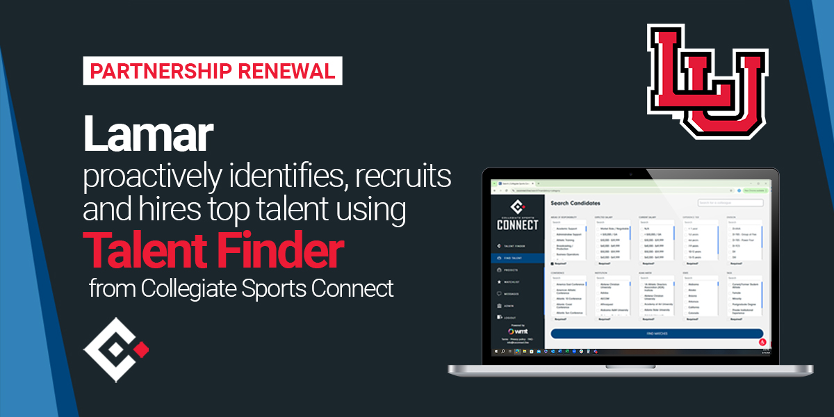 Lamar is the latest institution to renew its subscription to Collegiate Sports Connect's Talent Finder tool, an essential resource designed to help athletic departments proactively identify and recruit the perfect fit for administrative staff openings. As a part of its deal with Connect, Lamar also receives unlimited job postings to CollegeSports.jobs, the most visible jobs board across the industry with the distribution benefits of D1.ticker. (link)