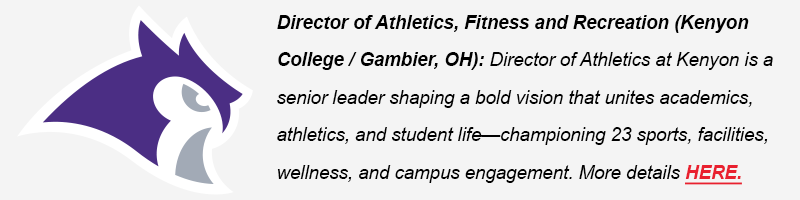 (NEW!) Director of Athletics, Fitness and Recreation (Kenyon College / Gambier, OH): Director of Athletics at Kenyon is a senior leader shaping a bold vision that unites academics, athletics, and student life—championing 23 sports, facilities, wellness, and campus engagement. More details HERE.