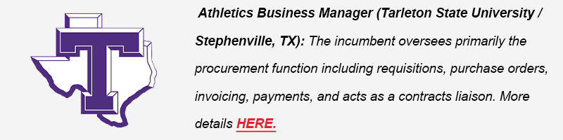 (NEWEST!) Athletics Business Manager (Tarleton State University / Stephenville, TX): The incumbent oversees primarily the procurement function including requisitions, purchase orders, invoicing, payments, and acts as a contracts liaison. More details HERE.