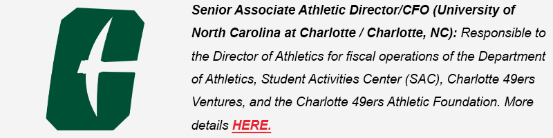 (NEWEST!) Senior Associate Athletic Director/CFO (University of North Carolina at Charlotte / Charlotte, NC): Responsible to the Director of Athletics for fiscal operations of the Department of Athletics, Student Activities Center (SAC), Charlotte 49ers Ventures, and the Charlotte 49ers Athletic Foundation. More details HERE.