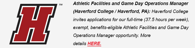 (NEW!) Athletic Facilities and Game Day Operations Manager (Haverford College / Haverford, PA): Haverford College invites applications for our full-time (37.5 hours per week), exempt, benefits-eligible Athletic Facilities and Game Day Operations Manager opportunity. More details HERE.