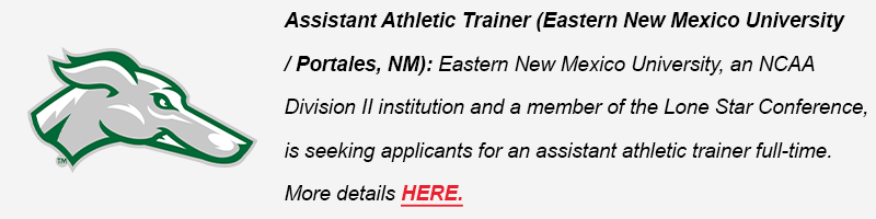 (NEW!) Assistant Athletic Trainer (Eastern New Mexico University / Portales, NM): Eastern New Mexico University, an NCAA Division II institution and a member of the Lone Star Conference, is seeking applicants for an assistant athletic trainer full-time. More details HERE.