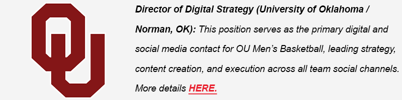 (NEWEST!) Director of Digital Strategy (University of Oklahoma / Norman, OK): This position serves as the primary digital and social media contact for OU Men’s Basketball, leading strategy, content creation, and execution across all team social channels. More details HERE.