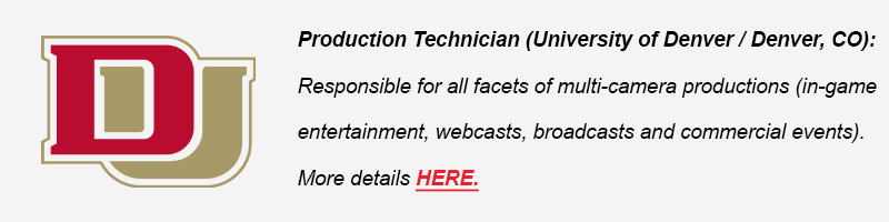 (NEWEST!) Production Technician (University of Denver / Denver, CO): Responsible for all facets of multi-camera productions (in-game entertainment, webcasts, broadcasts and commercial events). More details HERE.
