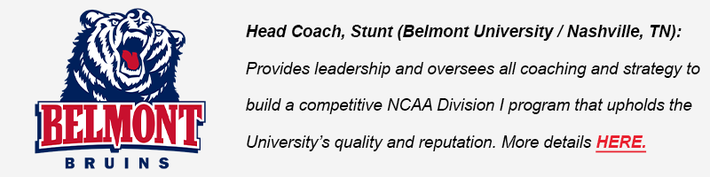 (NEWEST!) Head Coach, Stunt (Belmont University / Nashville, TN): Provides leadership and oversees all coaching and strategy to build a competitive NCAA Division I program that upholds the University’s quality and reputation. More details HERE.