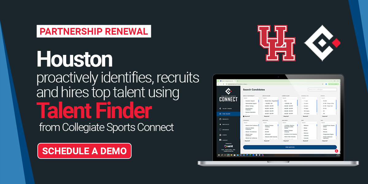 Houston is the latest institution to extend its partnership with Collegiate Sports Connect. In today's job market, hope is not a hiring strategy. With Talent Finder, Houston will continue to move beyond the applicant pool and proactively recruit the industry's top professionals. (link)