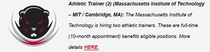 Athletic Trainer (2) (Massachusetts Institute of Technology – MIT / Cambridge, MA): The Massachusetts Institute of Technology is hiring two athletic trainers. These are full-time (10-month appointment) benefits eligible positions. More details HERE.