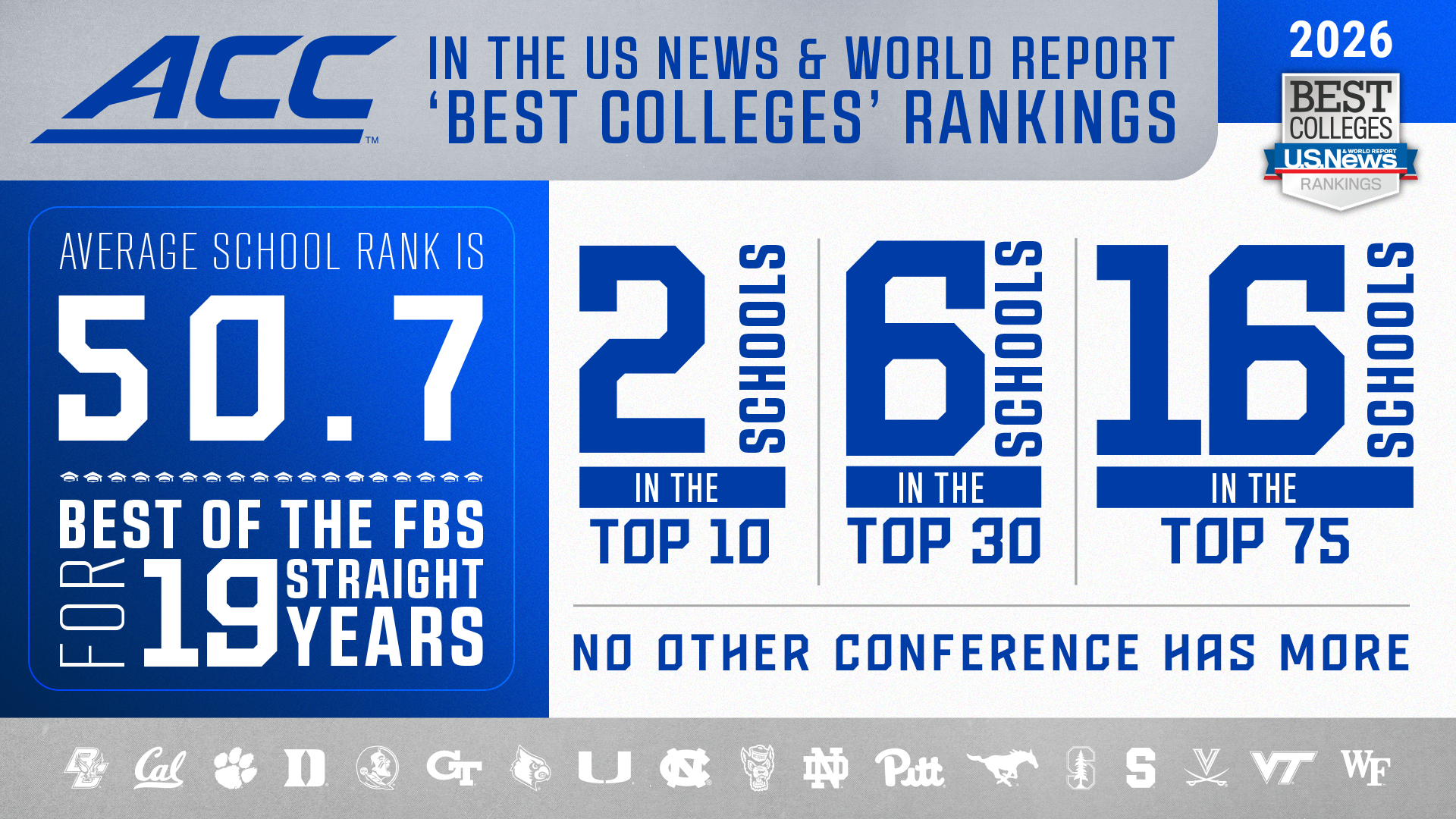 The ACC has topped the U.S. News & World Report “Best Colleges” rankings for the 19th straight year. Overall, the league managed the best average ranking among all FBS conferences with a 50.7 average and was the only conference with multiple universities rated in the nation’s top 10, Stanford (#4) and Duke (#7). In addition, four ACC schools landed in the top 25 and six were ranked in the top 30 to lead all FBS conferences, while 11 of the 18 institutions either maintained or improved their position from last year’s rankings. ACC Commissioner Jim Phillips: “Maintaining the strong academic foundation of intercollegiate athletics is a significant point of differentiation for the ACC as it’s essential to the long-term success and well-being of our student-athletes. We are proud that ACC institutions collectively uphold this national standard of academic and athletic achievement.” (link)