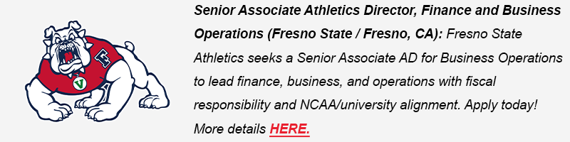 (NEWEST!) Senior Associate Athletics Director, Finance and Business Operations (Fresno State / Fresno, CA): Fresno State Athletics seeks a Senior Associate AD for Business Operations to lead finance, business, and operations with fiscal responsibility and NCAA/university alignment. Apply today! More details HERE.