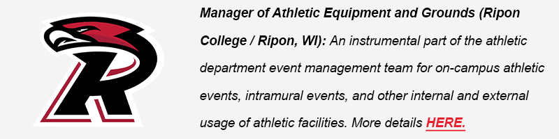 (NEW!) Manager of Athletic Equipment and Grounds (Ripon College / Ripon, WI): An instrumental part of the athletic department event management team for on-campus athletic events, intramural events, and other internal and external usage of athletic facilities. More details HERE.