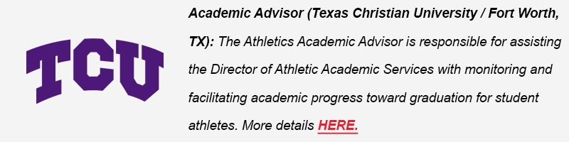 (NEW!) Academic Advisor (Texas Christian University / Fort Worth, TX): The Athletics Academic Advisor is responsible for assisting the Director of Athletic Academic Services with monitoring and facilitating academic progress toward graduation for student athletes. More details HERE.